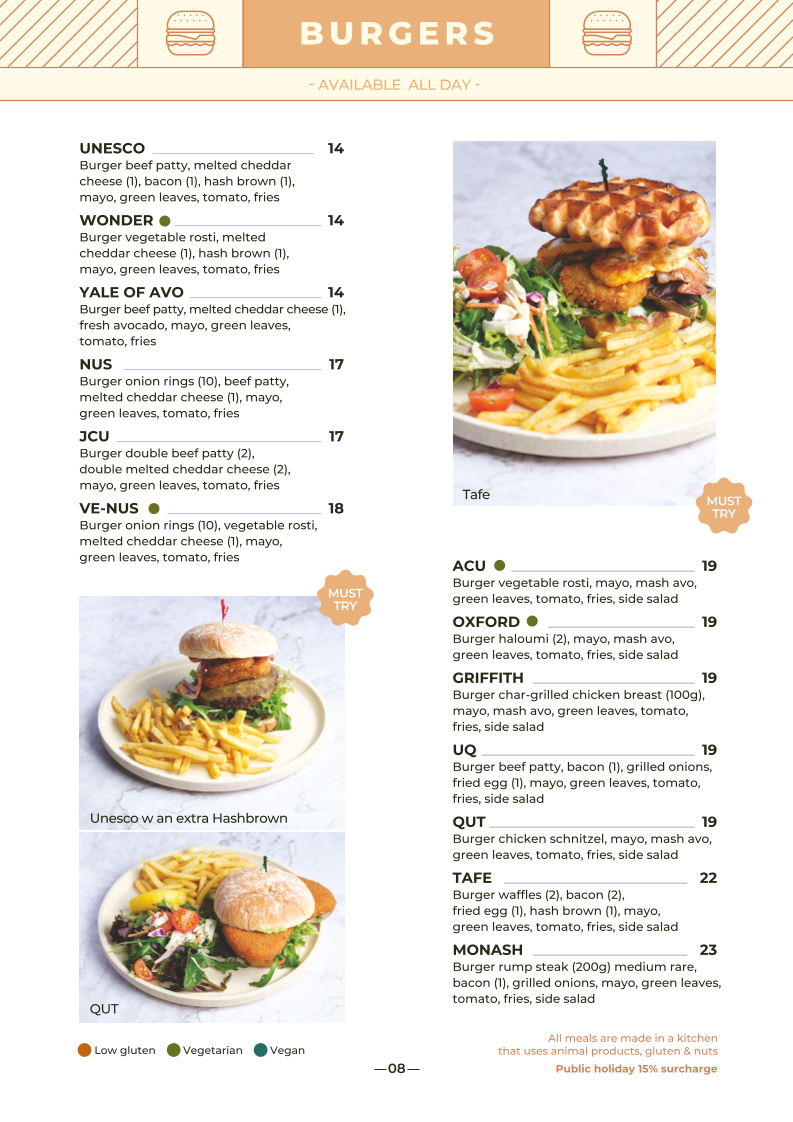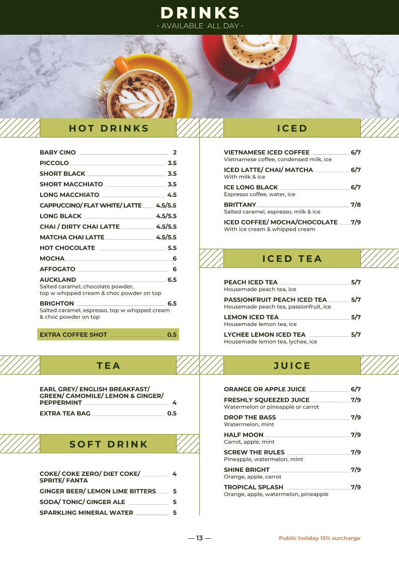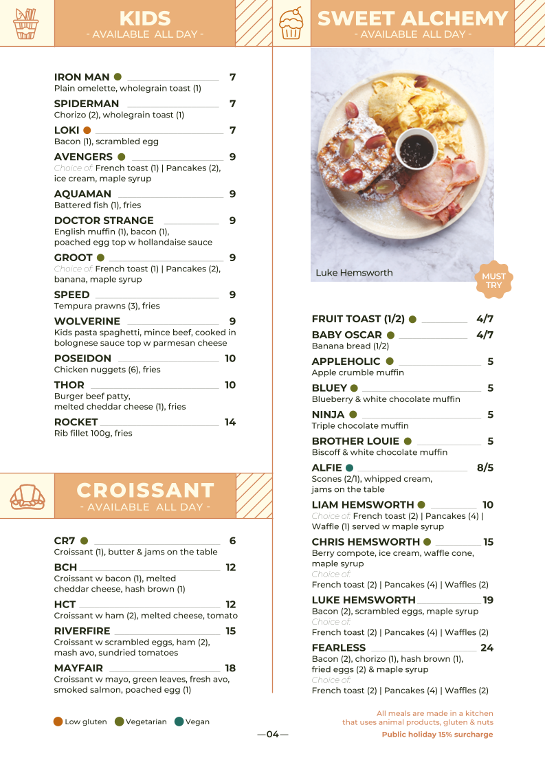 H Cafe & Bar at Deception Bay offers an extensive and diverse menu catering to various tastes and dietary preferences. For breakfast, you can indulge in favorites like G'DAY or HARVEST MOON, or opt for classics such as EGGS BENEDICT or WAFFLES EGGS BENEDICT. The café also offers a variety of omelettes like MARK WAHLBERG and STEPHANIE GILMORE, perfect for a hearty start to the day. Kids can enjoy fun options like IRON MAN and SPIDERMAN. For those who prefer something sweeter, there’s FRUIT TOAST or BABY OSCAR in the Sweet Alchemy section. The café's sandwiches and wraps, including the BLT and Q1, make for a tasty and satisfying lunch. Vegetarians and vegans will appreciate choices such as the VEGETABLE SPRING ROLL and VEGAN FRUIT SALAD, while gluten-free diners can enjoy RICE SALMON or THE THEATRE OF DREAMS. Main courses like S&P 500, RED DELICIOUS, and MARRY ME CHICKEN showcase a range of mouthwatering options. Whether you're in the mood for something light like SALADS or a hearty STEAK, the menu ensures there’s something for everyone. Don’t forget to treat yourself to a delicious dessert, such as BROTHER LOUIE or APPLEHOLIC, to complete your meal. With a wide selection of drinks from freshly squeezed juices and iced teas to cocktails like MANGO MONROE and SUMMER SANDLER, H Cafe & Bar truly has something for every taste.