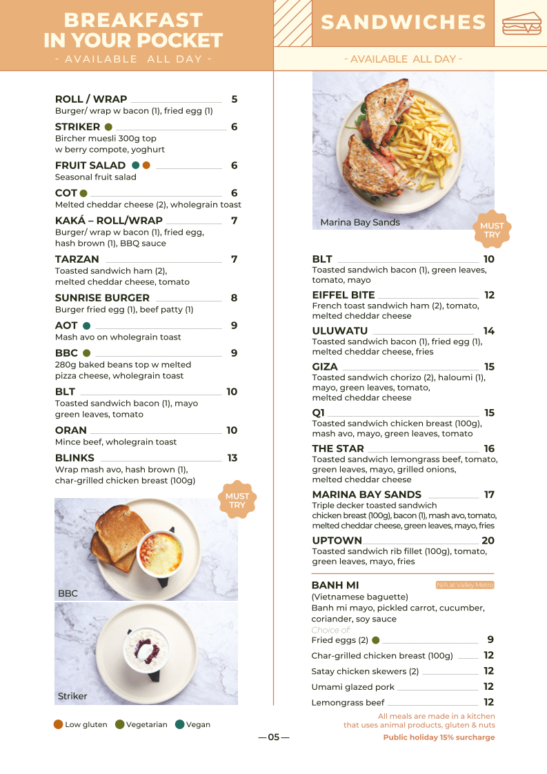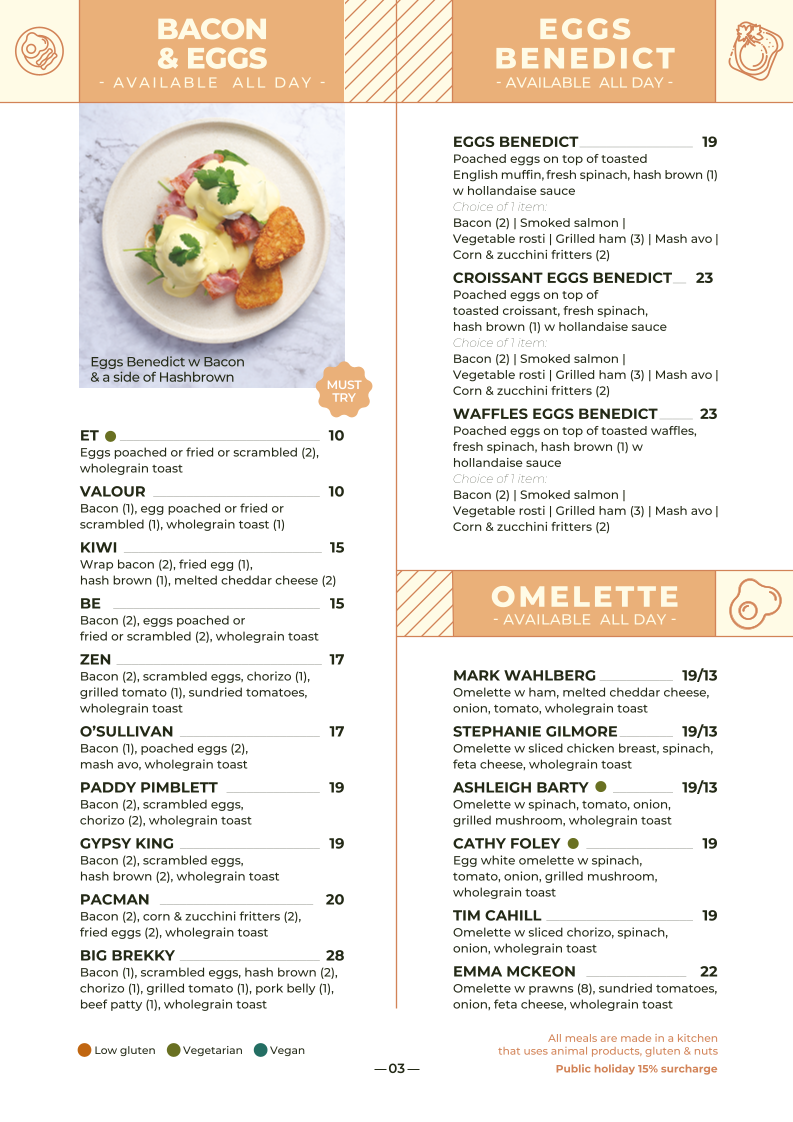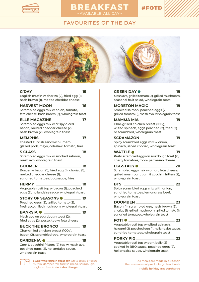 Bacon (1), scrambled eggs, hash brown (2), chorizo (1), grilled tomato (1), pork belly (1), beef patty (1), wholegrain toast