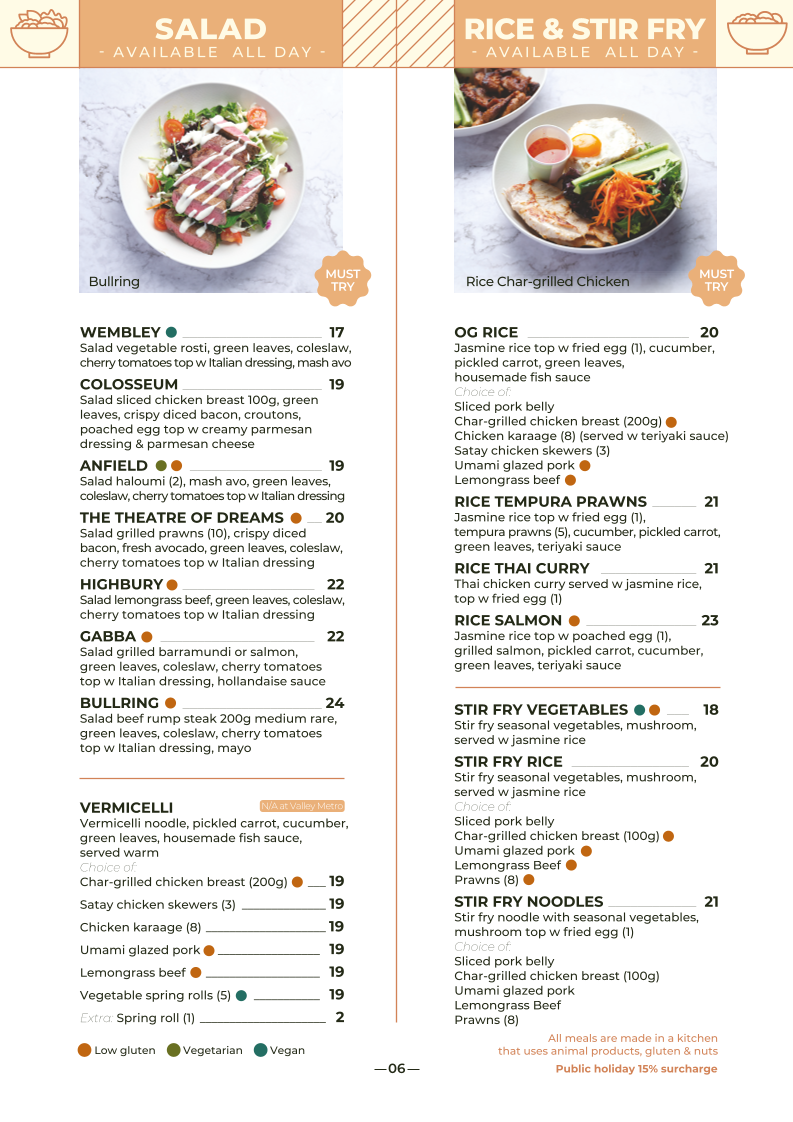 Jasmine rice top w fried egg (1), char-grilled chicken (200g), pickled carrot, cucumber, green leaves, housemade fish sauce