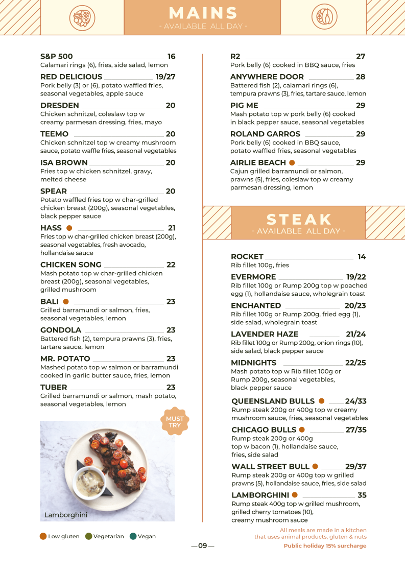 Mash potato top w Rib fillet 100g or Rump 200g, seasonal vegetables, black pepper sauce